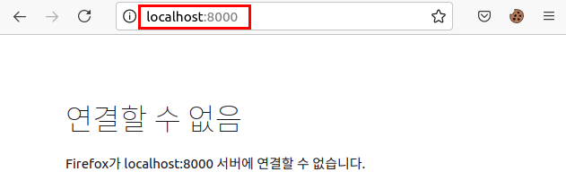 해당 컨테이너를 종료하니 ps에 실행 중인 컨테이너 목록에도 없고, localhost:8000으로 접속하면 연결 에러가 뜹니다.